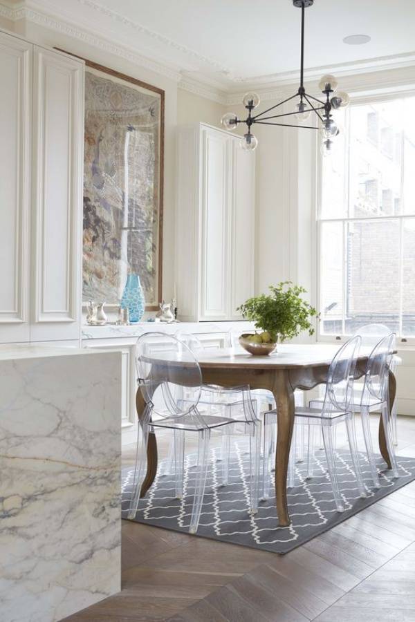 Một chiếc bàn cổ điển, mộc mạc sẽ thêm sự thu hút đặc biệt khi kết hợp với những chiếc ghế màu trắng trong suốt.