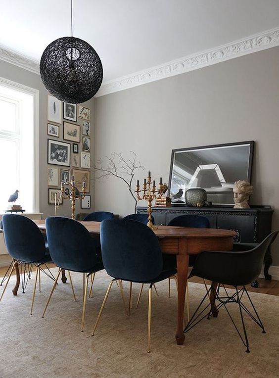 Bàn ăn bằng gỗ cũ kỹ được kết hợp với những chiếc ghế bằng nhung màu xanh lạm với chân ghế mạ vàng tạo nên phong cách cổ điển đầy ấn tượng.