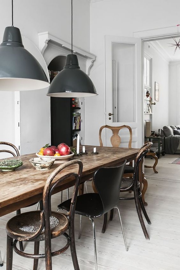 Bàn gỗ đã cũ kỹ, sờn màu sơn vẫn hiện diện một cách duyên dáng khi đặt ở không gian trang trí theo phong cách Scandinavian, và càng khiến không gian sinh động hơn nhờ những chiếc ghế kim loại đầy màu sắc.